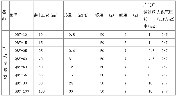 QBY系列氣動隔膜泵是一種新型輸送機(jī)械,是目前國內(nèi)新穎的一種泵類。采用壓縮空氣為動力源,對于各種腐蝕性液體,均能予以抽光吸盡。其性能參數(shù)與聯(lián)邦德國的WLLDENPVMPS、美國的MARIOWPUMPS相近,已被國內(nèi)近一千多家石油、化工、電子、陶瓷、紡織系統(tǒng)單位采用,安置在各種 殊場合,用來抽送各種常規(guī)泵不能抽吸的介質(zhì),均取得了滿意的效果,也可根據(jù)用戶要求,分為鑄鐵、不銹鋼、鋁合金