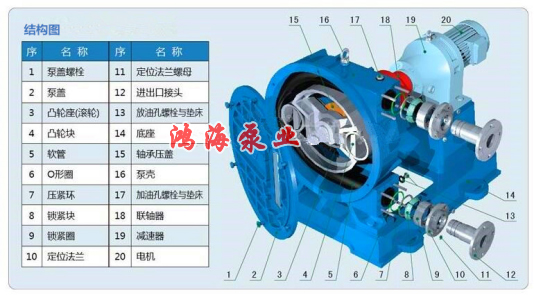 一根內(nèi)壁光滑、強(qiáng)度 的 制橡膠軟管安裝在泵內(nèi)部,通過(guò)一對(duì)壓輥沿著軟管旋轉(zhuǎn)擠壓,這樣的旋轉(zhuǎn)使得介質(zhì)往一個(gè)方向輸送而不會(huì)有倒流軟管在輸送介質(zhì)之后, 由被壓扁軟管的自身彈性和側(cè)導(dǎo)輥的強(qiáng)制下,管子恢復(fù)原狀,此時(shí),軟管內(nèi)產(chǎn)生高真空將物料吸入管腔;然后,物料在隨之而來(lái)的壓輥擠壓下從軟管內(nèi)排出。如此周而復(fù)始,物料不斷地被吸入和排出。